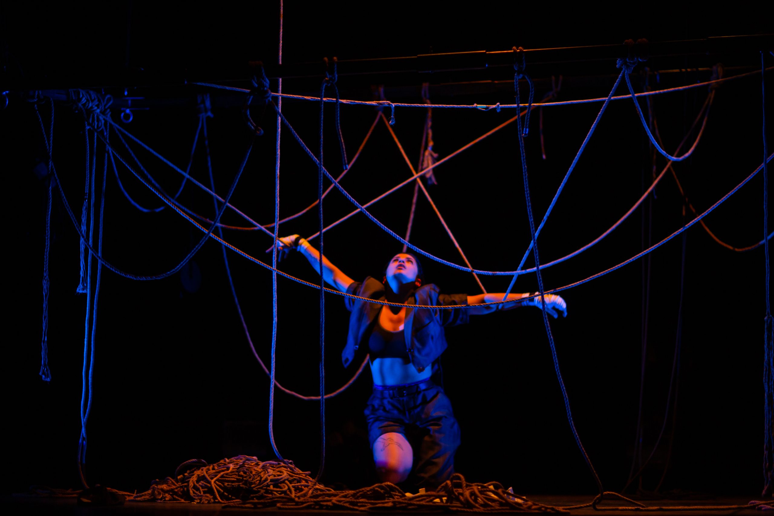 Directed by Bรฉnรฉdicte Allard, the play alternates between shadow and light. The narrative progresses, supported by an evolving stage design: a modular metal frame, ropes symbolizing control, and lighting effects that convey the shift from an idyll to violence. The electronic music from Clรฉment Althaus heightens the emotional intensity of each scene.
