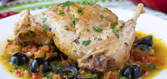 Then add the rabbit and the bouquet garni. Let it simmer for about 20 minutes over medium heat, then let reduce by half over low heat for the remaining time. At the last moment, add the Niçoise black olives.