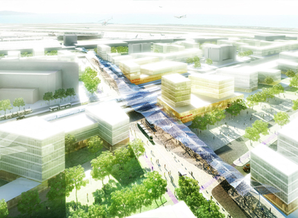 An organization on a North-South axis on either side of the railway, linking the airport to the road to Grenoble, around a structuring public space, allowing them to be interconnected in a peaceful urban approach. Urban project management studies will be initiated at the beginning of 2011. They will focus notably on the design missions, the preliminary project, and the project related to the realization of the hub’s infrastructures. Construction is planned to start in 2013 if funding is secured.