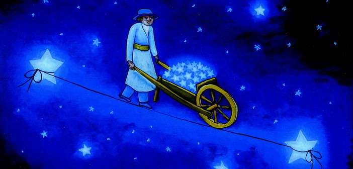 These paintings, indeed, are bearers of dreams. Stars, planet Earth, young children painting… The naรฏve artworks are inspired by his legends and folklore.