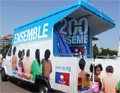On the beachside, this Friday, August 24, 2007, in Cannes (06), where the sand covers the sidewalk, sits a rather special caravan. The sides of this caravan are adorned with images of children from the back, wearing swimsuits, sitting on a beach looking at the word โTOGETHERโ against a blue backdrop, like the sea. This word, โTOGETHER,โ as if to invite vacationers to build their France. This caravan, as you might have guessed, belongs to the UMP.