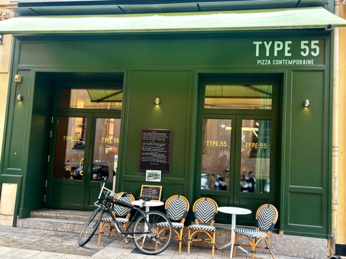 In the heart of Old Nice, surrounded by famous Niçoise palaces, **the restaurant Type 55** catches the eye with its chic and modern dark green façade. Its small terrace, typical of pedestrian streets, charms with its rattan chairs featuring a blue and white chevron pattern. Then, there’s the blackboard where a tempting menu featuring French dishes is displayed in chalk!