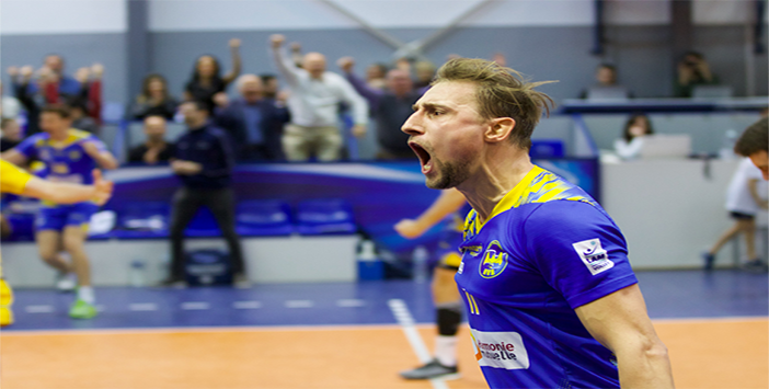 A few minutes later Nice thought they had broken away (21-19), as captain Zeljko Coric rallied the crowd. Nevertheless, the spirited Toulouse side allowed them to come back to tie at 24, and the set needed a two-point difference to be decided. The Eagles secured this crucial set after a contentious action at the net. The referees resorted to video review. The final call favored NVB, leading the numerous supporters to rise in unison (set ended 26-24).